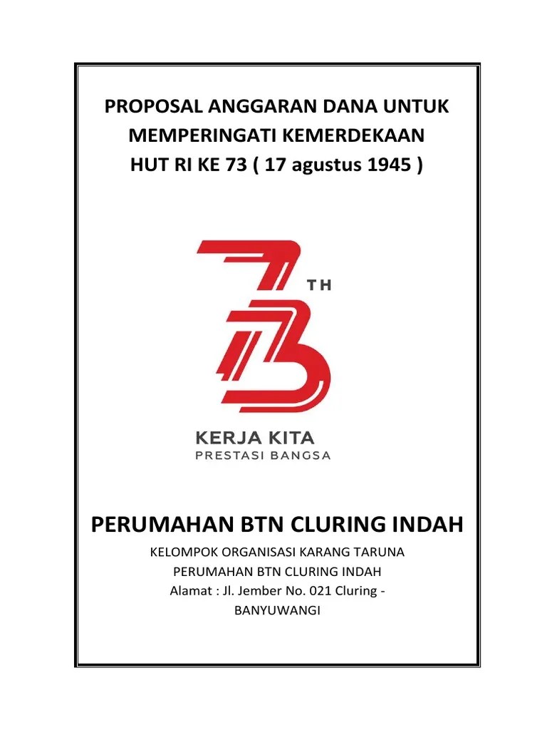 Lingkungan rt 005/02 kelurahan jatirahayu. Segera dapatkan contoh proposal 17 agustus 2020hut ri ke 75 ini untuk mengajukan dana biaya kegiatan acara dan lomba di desa, rt, sekolah, . Contoh proposal kegiatan 17 agustus untuk tingkat rt yang singkat, padat, jelas dan lengkap dengan susunan panitia, jenis kegiatan, . Prosedur penyusunan proposal kegiatan 17 agustus beserta contoh lengkapnya. Silahkan kunjungi postingan contoh proposal 17 agustus dalam rangka hari kemerdekaan ri lengkap dengan biaya untuk membaca artikel selengkapnya. Proposal 17 agustus merupakan sesuatu yang wajib ada ketika kita ingin membuat acara 17 agustus. Karena dengan proposal kita bisa mengetahui . Membuat proposal merupakan salah satu hal . Berikut ini beberapa contoh format proposal untuk acara 17 agustus di sekolah, masyarakat baik tingkat rt, rw, maupun untuk karang taruna . Agar gelaran 17 agustus makin meriah maka tak jarang digelar sebuah acara sebagai rangkaian memperingati hut kemerdekaan ri.